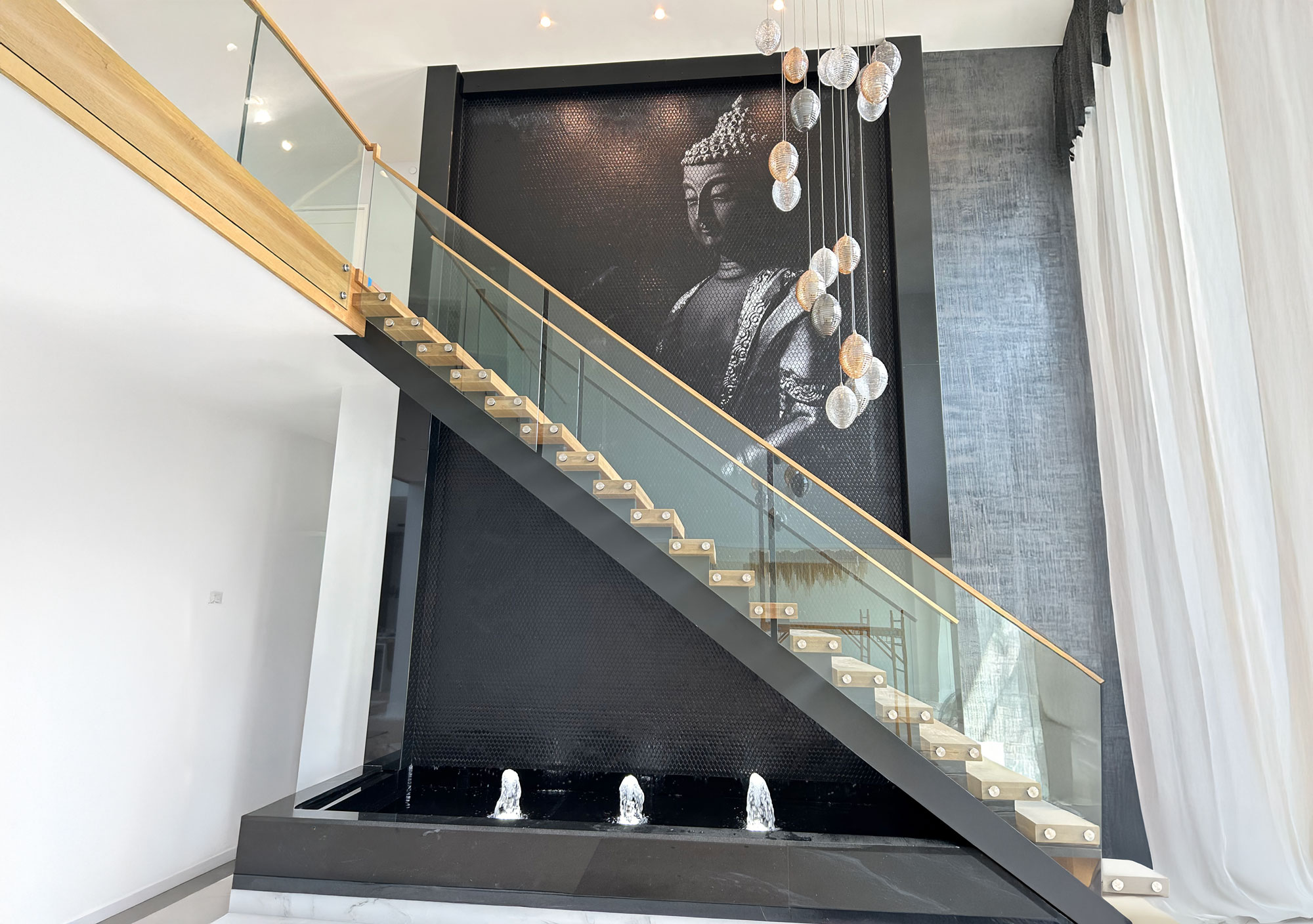 Distinctive water features are custom-designed installations created for spaces that require something beyond standard formats. From freestanding sculptural elements to wall-mounted statement pieces, these features combine controlled water movement, lighting, and material design to define space, guide circulation, and create a clear visual identity—indoors or outdoors.